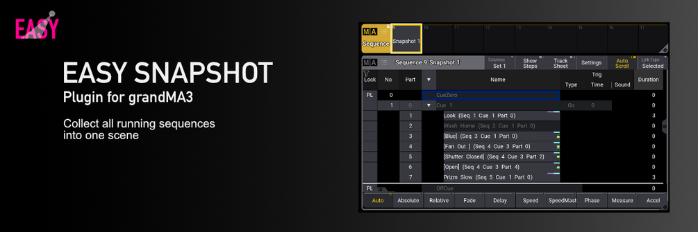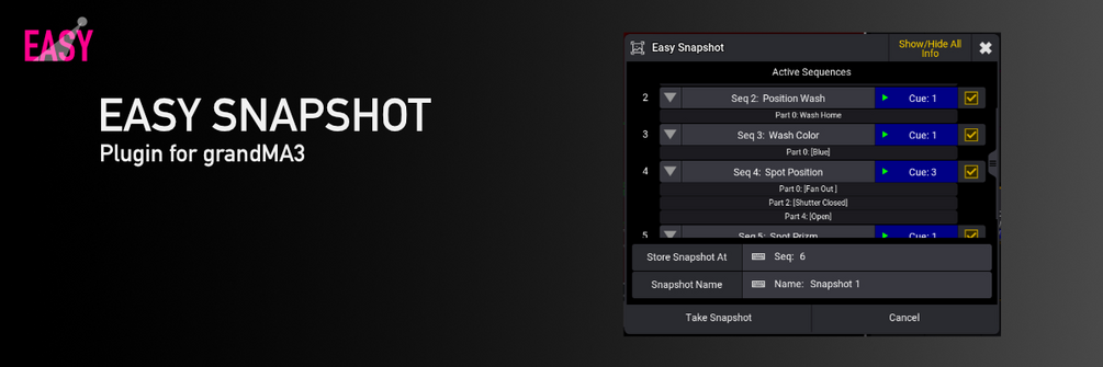 The plugin scans all running sequences and identifies which Cues are currently playing. It then copies all Parts of these active Cues into a new sequence, effectively gathering a scene assembled from different sequences into a single new sequence. It works with both regular Cues and Recipes.